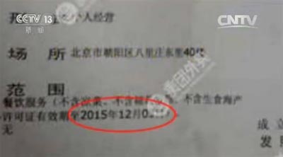 在美團外賣的應用平臺上,央視記者隨機搜索到一家“萬記麻辣燙”的商家,登記在平臺上的地址為:朝陽區(qū)八里莊東里小區(qū)41棟西側。而在美團外賣平臺上商家資質(zhì)公示的證照上,登記的卻不是同一個地址。不僅如此,餐飲業(yè)必須具備的“三證齊全”卻只有“營業(yè)執(zhí)照”和“餐飲服務許可證”兩證,而且這兩個證件上清晰地顯示,有效期截止日期均為2015年12月。