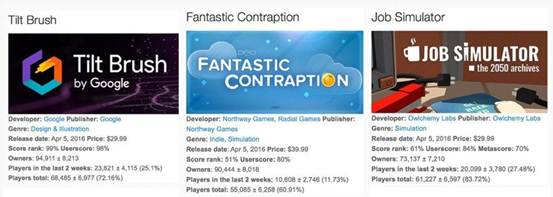 SteamSpy是steam的數(shù)據(jù)庫網(wǎng)站,就如同它的名字一般,真的是像個間諜一樣可以在上面查到所有你想要的關(guān)于steam的數(shù)據(jù),如購買人數(shù)、實(shí)時在線人數(shù)、玩的時長等。HTC vive于2016年4月發(fā)貨,在4月-7月這段早期發(fā)售時間里vive以捆綁銷售的方式捆綁了3款游戲《Tilt Brush[iii]》、《FantasticContraption[iv]》和《Job Simulator[v]》在vive里,那么通過看這段時間里這3款游戲的持有人數(shù)量就能大致的推斷截止7月底HTC vive的銷量。如下圖: