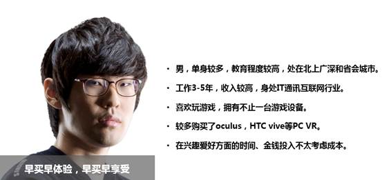這類用戶的精力旺盛,追逐刺激體驗(yàn),大都在購買前有在各種渠道(借別人的、體驗(yàn)店等)體驗(yàn)過,對VR帶來的全景體驗(yàn)覺得新奇,對VR游戲特別期待。猴急猴急的想自己擁有一臺VR,覺得酷斃了。這里想想自己當(dāng)年想買游戲機(jī)時候急切的心情就是了。