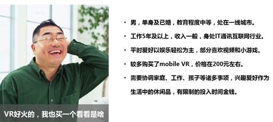 在研究中提煉到的第二類典型用戶也很有意思,他們是VR的跟風(fēng)購買者,同時,他們也是性價比追求者。他們清楚VR目前在這個階段尚不成熟,但同時又想跟風(fēng)體驗(yàn),所以他們不會花很大的價錢去追逐購買。他們也明白自己是跟風(fēng)體驗(yàn),所以只會為這種跟風(fēng)體驗(yàn)支付相應(yīng)的低成本費(fèi)用,主要購買Mobile VR,價格在200元左右。也并不是他們付不起,只是覺得不值當(dāng)。