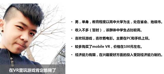 在定量研究中發(fā)現(xiàn)了一批我們原來沒有想到的用戶,他們以學(xué)生群體居多。正是精力旺盛的年齡里他們熱愛一切新鮮事物,愛玩游戲,越刺激越好。奈何迫于收入的限制購買的以Mobile VR為主,價格在100元左右。他們也知道幾千塊的體驗(yàn)更好,但是當(dāng)下只能買個便宜的過過癮。