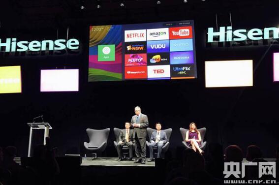 中國(guó)家電廠商海信(Hisense)在CES消費(fèi)電子展商發(fā)布會(huì)雙色4K激光電視新品。