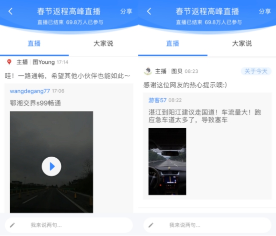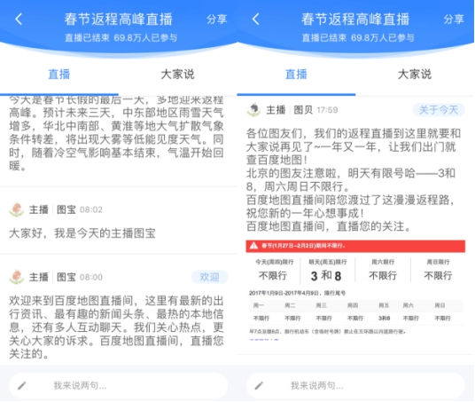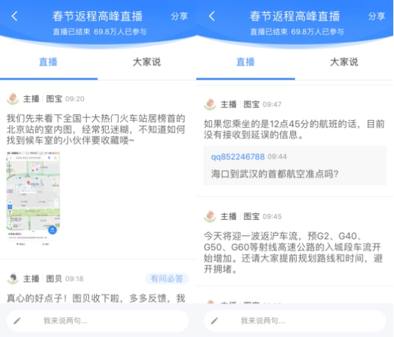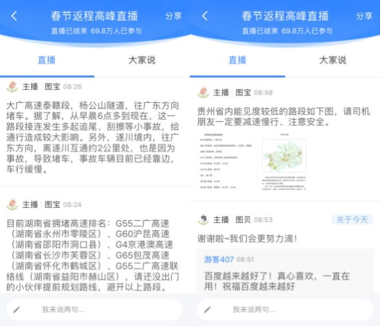 2月3日,大家迎來了節(jié)后第一個工作日。昨天——春節(jié)長假最后一天,車流、客流集中返程,再加上高速免費,很多人經(jīng)歷了一場節(jié)后返程“大作戰(zhàn)”。為了幫助廣大用戶合理安排出行計劃順利返程,2月2日早上8點,百度地圖及時上線“返程交通直播”:直播開啟第一個小時內(nèi),就有累計20萬人涌入直播間參與互動,刷新直播間記錄;直播一直持續(xù)到下午6點,長達(dá)10個小時,總參與人數(shù)達(dá)到69.8萬。