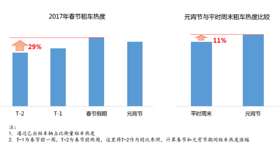 租車自駕游正在成為國民春節(jié)重要組成部分。滴滴數(shù)據(jù)顯示,2017年春節(jié)大量用戶選擇租車自駕游,其熱度從春節(jié)前一周開始升溫,假期當周較半個月前高出29%,到元宵節(jié)依然維持較高熱度,比平時的周末增加了11%。由此可見,除了超長“駕期”之外,不少用戶選擇“早出”或“晚歸”,以避開出行高峰。