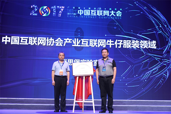 中國互聯(lián)網(wǎng)協(xié)會(huì)秘書長(zhǎng)盧衛(wèi)與山東海思堡服裝服飾集團(tuán)股份有限公司董事長(zhǎng)馬學(xué)強(qiáng)為“產(chǎn)業(yè)互聯(lián)網(wǎng)牛仔服裝領(lǐng)域海思堡實(shí)驗(yàn)室”揭牌