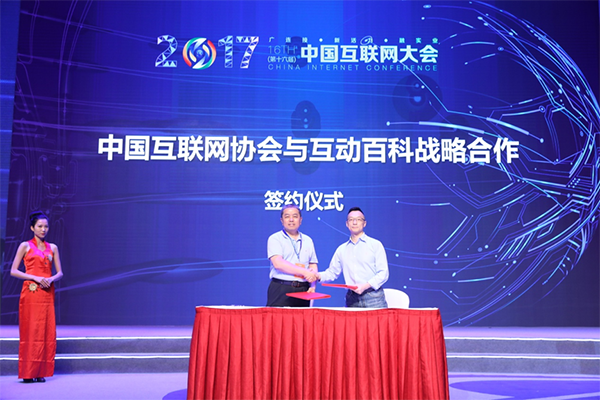 中國互聯(lián)網(wǎng)協(xié)會(huì)秘書長(zhǎng)盧衛(wèi)與互動(dòng)百科創(chuàng)始人潘海東董事長(zhǎng)簽署戰(zhàn)略合作協(xié)議