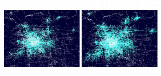 將訂單還原至具體地點(diǎn)(上圖),不難看出,拼車和非拼車的訂單分布大體相似,但前者更多聚集在城市中心區(qū)域。在全國拼車節(jié)約里程排行榜上,北京僅次于成都位列第二,同樣上榜的還有天津、深圳、廣州等城市。