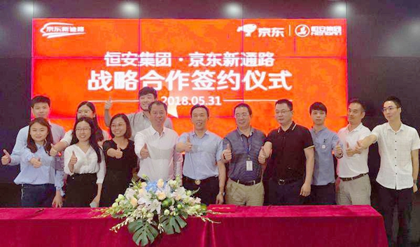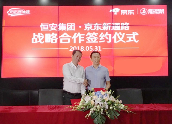 京東集團(tuán)副總裁、京東商城新通路事業(yè)部總裁鄭宏彥與恒安集團(tuán)COO、運(yùn)營中心總裁許水深簽署戰(zhàn)略合作協(xié)議