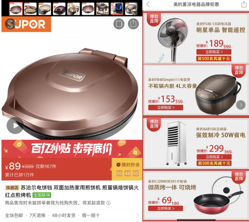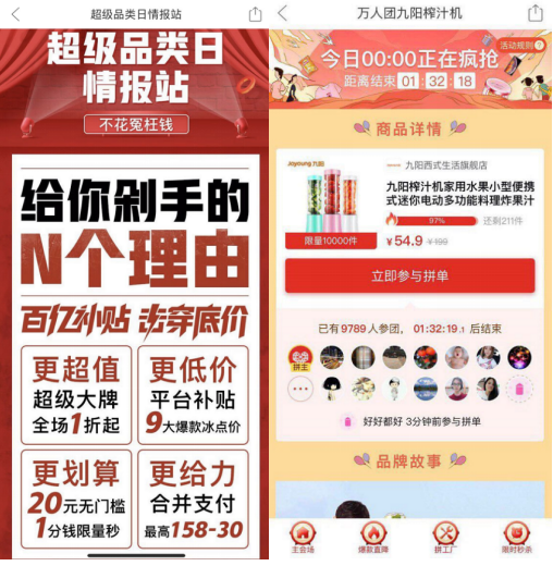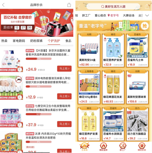 活動數(shù)據(jù)顯示,家電數(shù)碼、日化、母嬰類產(chǎn)品擁有最高的達成率:190元的美的電壓力鍋、89元的蘇泊爾煎餅機、54.9元的九陽榨汁機、259.9元的格蘭仕微波爐等家電系列標品,成為截至目前的明星產(chǎn)品。汰漬、多芬、七度空間等個護洗護類高頻消費品,在平均成團時長上占據(jù)明顯優(yōu)勢;“上海老字號品牌特惠專場“則在整體成交轉(zhuǎn)化率上維持領(lǐng)先。