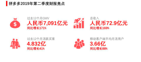 北京時(shí)間8月21日,新電商平臺(tái)拼多多(NASDAQ:PDD)發(fā)布了2019年第二季度財(cái)報(bào)。財(cái)報(bào)顯示,截至2019年6月30日的12個(gè)月期間,平臺(tái)GMV達(dá)7091億元,較去年同期的2621億元同比增長(zhǎng)171%;二季度,拼多多實(shí)現(xiàn)營(yíng)收72.90億元,較去年同期的27.09億元同比增長(zhǎng)169%,較今年一季度的45.452億元,環(huán)比增長(zhǎng)60%。