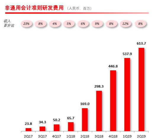 ▲2019年第二季度,拼多多研發(fā)費(fèi)用攀升至8.037億元,同比增長(zhǎng)332%。平臺(tái)研發(fā)費(fèi)用占收入比為11%,高于行業(yè)平均水平。