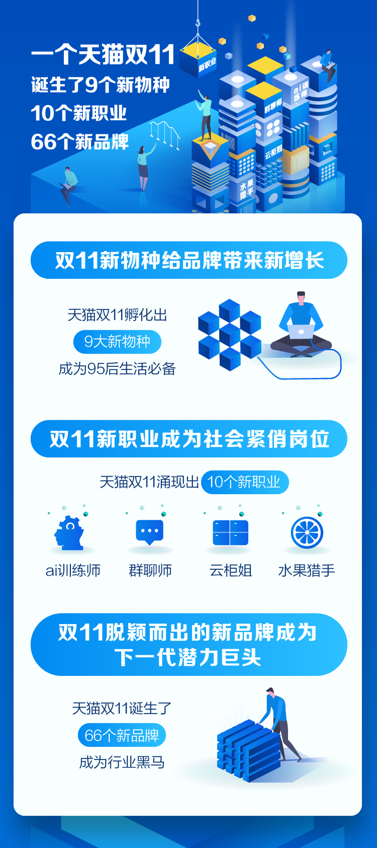群聊師的人才缺口為300萬,水果獵人月薪高達(dá)2萬。同時(shí),筋膜槍、喵喵機(jī)、洗鞋機(jī)、三明治早餐機(jī)等新物種,也引發(fā)網(wǎng)友討論。新物種的走紅也帶火了一批新銳品牌,天貓雙11,66個(gè)新銳品牌冒尖。其中,三頓半、SHARK等11個(gè)新銳品牌拿下品類排行榜第一,更有完美日記、HFP、花西、Dr.Arrivo、小仙燉、燕之屋6個(gè)新品牌單日成交超過1億,與蘋果、耐克等大牌同登天貓雙11“億元俱樂部”。