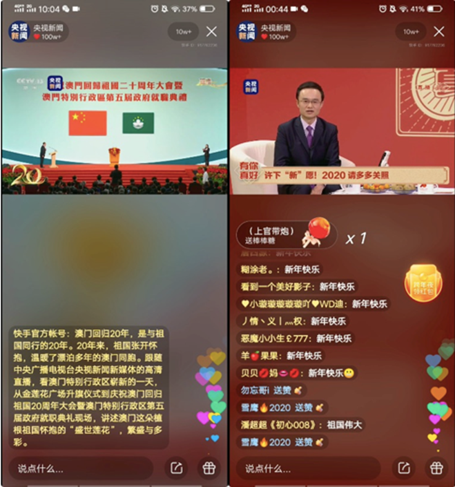 在澳門回歸祖國(guó)20周年之際,快手聯(lián)合央視新聞進(jìn)行了6場(chǎng)系列直播,累計(jì)觀看人次超過4000萬;跨年夜,央視新聞推出“有你真好”特別節(jié)目,在快手號(hào)全程同步直播,直播答題互動(dòng)形式也首次出現(xiàn)在央視跨年特別節(jié)目中,累計(jì)觀看人數(shù)1.4億。
