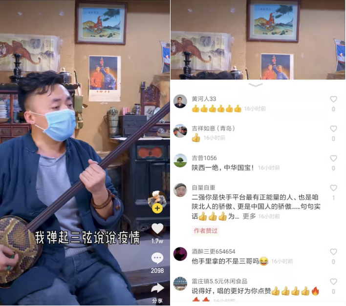用戶貳強(qiáng)(ID:deq16888)在快手上擁有69.9萬粉絲,是一名陜北傳統(tǒng)文藝愛好者。貳強(qiáng)尤其擅長(zhǎng)陜北說書,疫情期間,他將勸告大家不要走親訪友的“勸阻”詞寫進(jìn)陜北說書里,然后手撥三弦,以網(wǎng)友們們愛聽的陜北曲調(diào)高亢地唱出來。