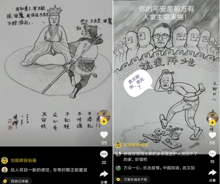 民俗畫家、漫畫家“劉現(xiàn)輝民俗畫”(ID:liuxianhui999)通過漫畫的形式宣傳抗疫。他上傳的動(dòng)畫版作品顯示,孫悟空手拿金箍棒為師傅唐僧畫了一個(gè)安全的圈,叮囑師父不要出來,“不出來,冠魔就害不了你”。唐僧回答道:“我知道了,我不能除冠魔,我保證不出去,不給添亂!甭嬒路剑有劉現(xiàn)輝題寫的三字口訣:不出門,不添亂、不傳謠、不亂轉(zhuǎn)、眾心齊、滅冠妖。動(dòng)畫帶配音,耳目一新。