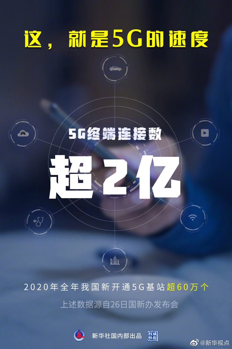 工信部26日發(fā)布數(shù)據(jù),2020年全年我國新開通5G基站超60萬個,5G終端連接數(shù)超過2億,超高清視頻、云游戲等個人應用場景逐漸豐富。5G網(wǎng)絡和終端商用快速發(fā)展,越來越多的人感受到5G的速度。(記者:張辛欣 海報設計:張晨光) ????