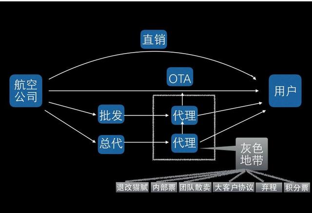 在航空公司與用戶之前,機(jī)票銷售用多種方式:直銷、OTA、平臺(tái)以及代理。在航空公司銷售機(jī)票的過程中,機(jī)票代理占據(jù)了重要位置。
