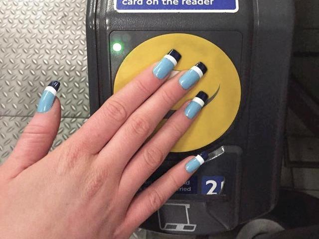 Davis把Oyster卡(公交預(yù)付卡)中的RFID芯片放進了丙烯酸材質(zhì)的人工指甲當(dāng)中,佩戴者只要把手指靠近讀卡器就能快速刷卡上車。這樣一來,你就再也不必?fù)?dān)心公交卡忘帶或是弄丟了。