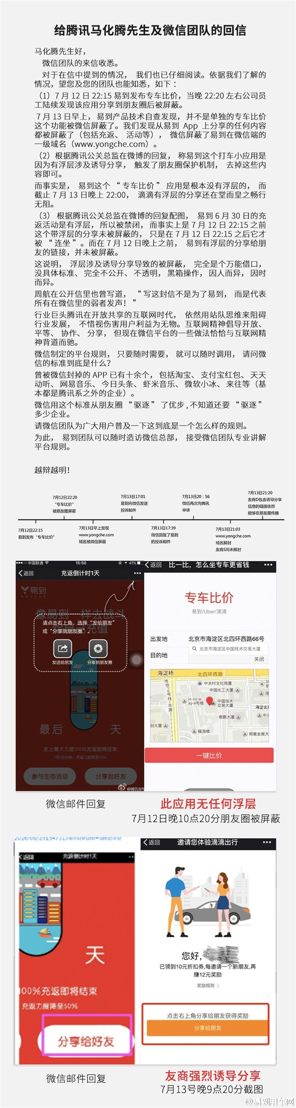 公開信中成,易到專車比價軟件及易到App分享到朋友圈的內(nèi)容皆被微信屏蔽,不太明白“此事的內(nèi)在邏輯是什么”;并向馬化騰提出質(zhì)疑,微信的做法有違共享,有違互聯(lián)網(wǎng)精神。