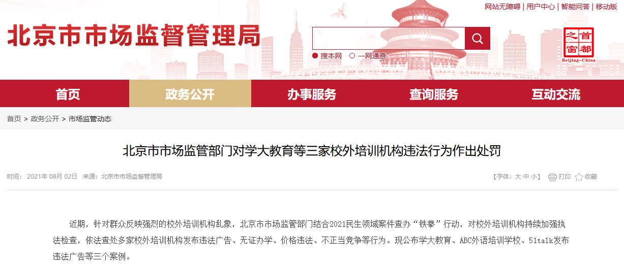 北京市市場監(jiān)督管理局稱,近期,針對(duì)群眾反映強(qiáng)烈的校外培訓(xùn)機(jī)構(gòu)亂象,北京市市場監(jiān)管部門結(jié)合2021民生領(lǐng)域案件查辦“鐵拳”行動(dòng),對(duì)校外培訓(xùn)機(jī)構(gòu)持續(xù)加強(qiáng)執(zhí)法檢查,依法查處多家校外培訓(xùn)機(jī)構(gòu)發(fā)布違法廣告、無證辦學(xué)、價(jià)格違法、不正當(dāng)競爭等行為,F(xiàn)公布學(xué)大教育、ABC外語培訓(xùn)學(xué)校、51talk發(fā)布違法廣告等三個(gè)案例。
