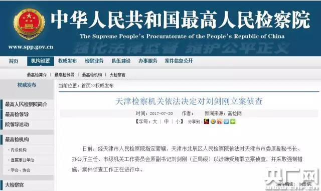 日前,經(jīng)天津市人民檢察院指定管轄,天津市北辰區(qū)人民檢察院依法對(duì)天津市市委原副秘書長(zhǎng)、辦公廳主任、市級(jí)機(jī)關(guān)工作委員會(huì)原副書記劉劍剛(正局級(jí))以涉嫌受賄罪立案?jìng)刹,并采取?qiáng)制措施。案件偵查工作正在進(jìn)行中。
