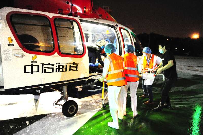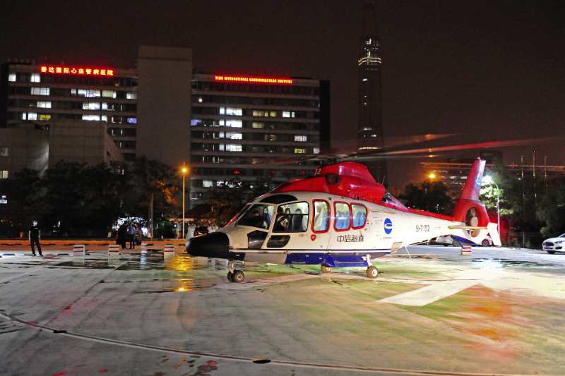 北大醫(yī)療海洋石油醫(yī)院立即啟動應(yīng)急預(yù)案,將患者心電圖、搶救用藥信息通過泰心互聯(lián)網(wǎng)醫(yī)院系統(tǒng)傳到泰心醫(yī)院胸痛中心,并決定啟動直升機(jī)救援,由海上平臺醫(yī)生護(hù)送患者前往泰心醫(yī)院胸痛中心。中信海洋直升機(jī)股份有限公司相關(guān)部門迅速進(jìn)行準(zhǔn)備,申請空域、準(zhǔn)備飛機(jī)、研究航線及天氣。同時(shí),泰心醫(yī)院迅速啟動綠色通道,后勤人員迅速準(zhǔn)備停機(jī)坪,急診醫(yī)護(hù)隨時(shí)準(zhǔn)備接診,心內(nèi)科、超聲科、介入中心工作人員也嚴(yán)陣以待;飛機(jī)于23點(diǎn)21分升空,前往平臺救援!9日00點(diǎn)13分抵達(dá)海上平臺。00點(diǎn)20分飛機(jī)在平臺起飛,載著患者飛越112海里(200多公里),于1點(diǎn)10分抵達(dá)泰心醫(yī)院停機(jī)坪。