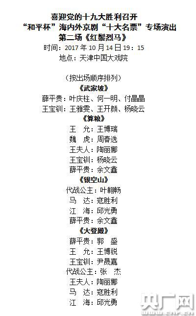 10月14日演出《紅鬃烈馬》,包括《武家坡》、《算糧》、《銀空山》、《大登殿》四折。薛平貴由葉慶柱、何一明、付晶晶、余文鑫、郭盛飾演。王寶釧由王雅雯、王開顏、楊曉云、尹晟嘉飾演。陶麗娜飾演王夫人、已經(jīng)成為專業(yè)演員的葉翱暢和張杰飾演代戰(zhàn)公主、王博瑞飾演王允、周春選飾演魏虎、寇勝利、邱光勇飾演馬達(dá)、江海。兩場(chǎng)演出均由天津京劇院擔(dān)任助演,充分體現(xiàn)出專業(yè)院團(tuán)為弘揚(yáng)國(guó)粹藝術(shù)甘當(dāng)綠葉的品質(zhì)。