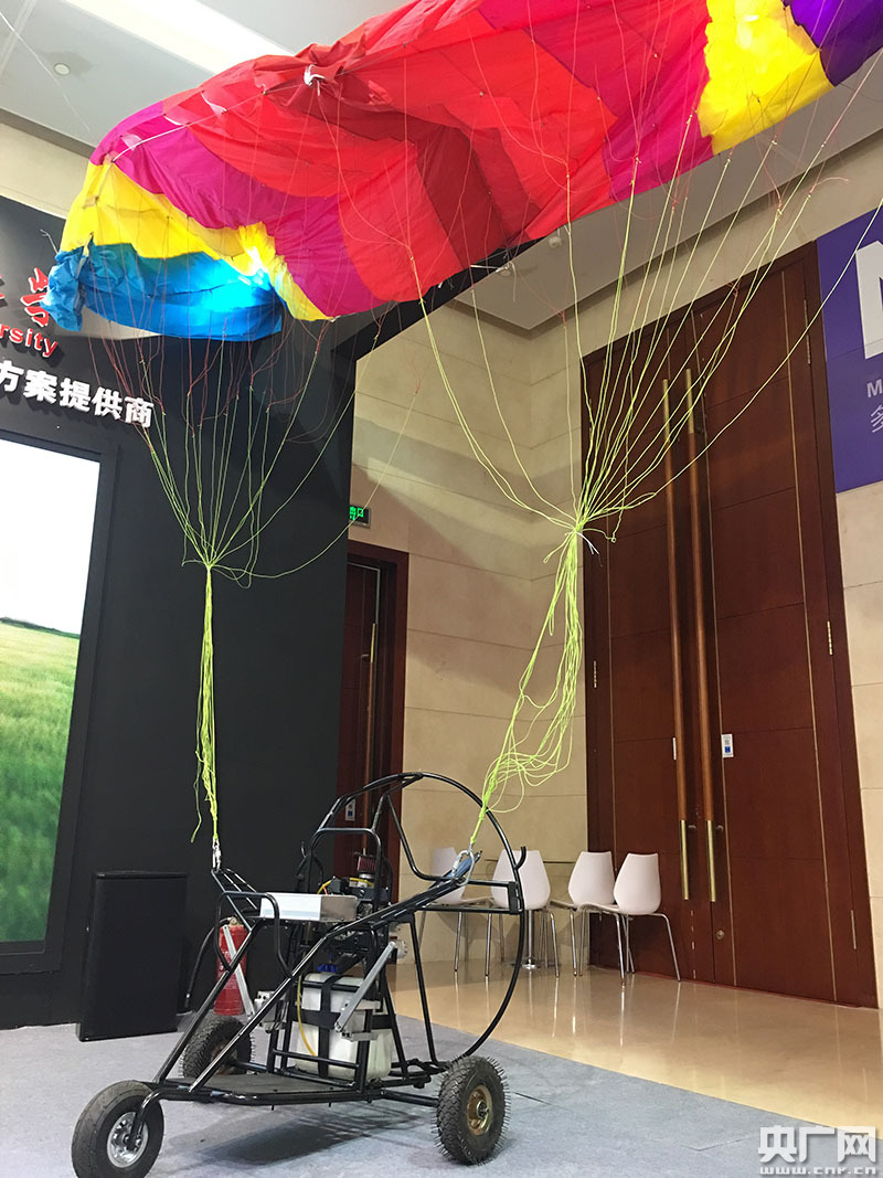 無(wú)人動(dòng)力傘,用于電力巡檢的無(wú)人動(dòng)力傘飛行里程長(zhǎng),速度慢,更方便進(jìn)行定點(diǎn)拍攝。一飛智控科技的參展商小杜介紹,動(dòng)力傘的原理是用無(wú)線電來(lái)操縱傘繩讓它按著既定的路線飛行,通過(guò)傘繩的牽引控制它的上升下降、轉(zhuǎn)彎、速度。飛起來(lái)以后通過(guò)動(dòng)壓向傘里充氣,傘就形成了可以提供升力的載體,于是可以把下面的小車給吊起來(lái)。動(dòng)力傘上裝有攝像頭,目前好多要交付的動(dòng)力傘是用于農(nóng)業(yè)。