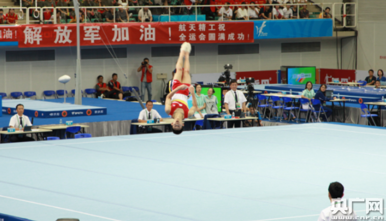 體操單項決賽沒有設(shè)置選手賽前熱身時間,各位選手在集體亮相后快速進入了比賽狀態(tài)。天津隊穆濟勒排在第二位出場,他選擇以向前1260度空翻接540度空翻的高難度動作開場,接著前手翻前屈兩周,540度接720度空翻都干凈利落的完成。結(jié)束動作穆濟勒選擇了直體后空翻轉(zhuǎn)體1080度,并完美落地。雖然穆濟勒出場順序較為靠前,但是裁判員并沒有吝惜分數(shù),難度分6.1,完成分8.967,總分15.067分。