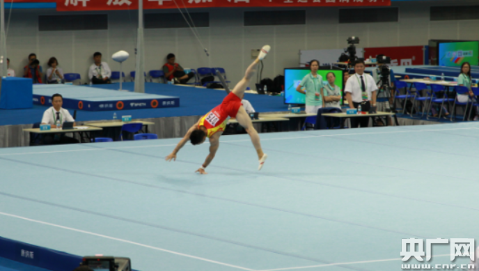 本次天津全運會體操項目執(zhí)行2017年至2020年奧運周期的新規(guī)則,男子自由體操的動作特定要求編排共分三組,第一組為非技巧動作,第二組為向前技巧與向前魚躍滾翻類動作,第三組為向后技巧與阿拉伯系列動作。