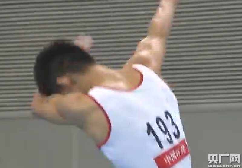 此時的林超攀總分僅次于穆濟勒排在第二,而緊隨林超攀出場的天津隊另一名選手孫冰,很快就奪走了他第二的位置。孫冰使用了一個直體后空翻兩周轉(zhuǎn)體360度開場,瀟灑的完成贏得了主場觀眾熱烈的掌聲,之后的團身后空翻兩周轉(zhuǎn)體720、900接360度都完成順利。巧合的是,孫冰最后選擇的結(jié)束動作也是直體后空翻轉(zhuǎn)體1080度,同樣穩(wěn)穩(wěn)落地,可惜雙腿在落地時略有分開。難度分6.2,完成分8.700,總分14.900分。