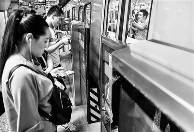 北青報記者在半個小時的時間內(nèi)觀察,乘客都在屏蔽門前較為有序地候車,沒有發(fā)生搶上搶下行為。