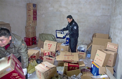1月29日,在烏魯木齊經濟技術開發(fā)區(qū)(頭屯河區(qū))三坪農場瀚坪路東八巷,民警正在收繳假酒。