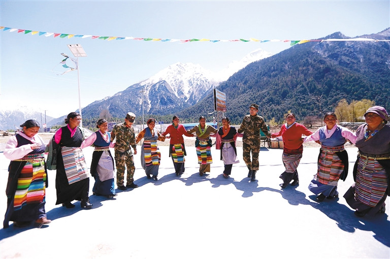 武警西藏公安邊防總隊吉隆邊防檢查站官兵與駐地村民,跳起感黨恩的舞蹈《鈴響瑪》,紀(jì)念西藏百萬農(nóng)奴解放58周年。中國西藏新聞網(wǎng)通訊員 胡俊浩 記者 次旺 攝
