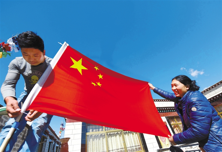 拉薩市城關(guān)區(qū)俄杰塘社區(qū)居委會居民玉珍(右)和玉杰在自家房頂上升起國旗,表達(dá)對黨的熱愛之情。中國西藏新聞網(wǎng)通訊員 胡俊浩 記者 次旺 唐斌 攝