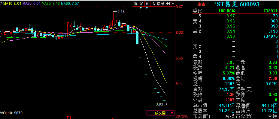 央廣網(wǎng)昆明7月17日消息(記者馬智波)7月16日,*ST易見(曾用名:易見股份)迎來復(fù)牌后第八個(gè)跌停,跌幅為5.07%。易見股份在4月30日停牌,停牌前連續(xù)三個(gè)交易日跌停,跌幅10%。從復(fù)牌前到現(xiàn)在,已經(jīng)連續(xù)11個(gè)跌停,以4月27日收盤價(jià)8.13計(jì)算,其股價(jià)跌幅已經(jīng)達(dá)到51.6%。