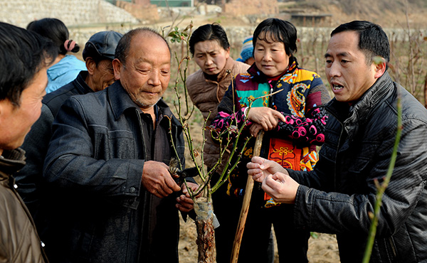 1月6日,園藝專業(yè)畢業(yè)的佛坪縣委組織部副部長田間(右一)在西岔河鎮(zhèn)銀廠溝村苗木基地與群眾一起交流嫁接玫瑰修剪管護技術。全縣部門包聯(lián)、特聘專家教授、農(nóng)業(yè)實用人才、致富能手,組建講師團、服務隊幫助群眾學技術,年培訓近百場次。