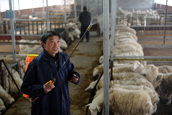 1月6日,西岔河鎮(zhèn)銀廠溝村黨支部書記馬光明在為養(yǎng)羊場地消毒。該村6名村組黨員率先發(fā)展肉牛和肉羊等種養(yǎng)產(chǎn)業(yè),實行股份制投資、分紅制度,以“黨支部+合作社+農(nóng)戶”模式帶動54戶村民參股發(fā)展產(chǎn)業(yè),為村民增收達70余萬元。