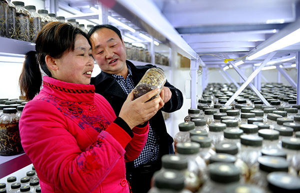 1月6日,鑫農(nóng)食用菌專業(yè)合作社黨支部書記翟玉軍(右)夫婦在原種培育室檢查原種生長情況。該合作社年生產(chǎn)6大類食用菌菌種40萬公斤、50余萬瓶,帶動400多戶村民增收致富。