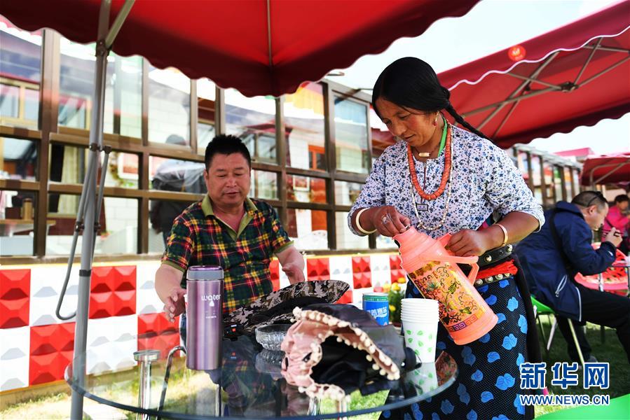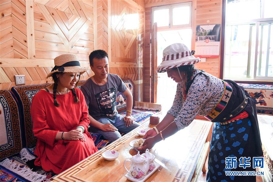 7月18日,甘肅省甘南藏族自治州碌曲縣尕海鄉(xiāng)尕秀村的一家“牧家樂”女主人拉姆措為就餐的游客盛上藏族奶茶。