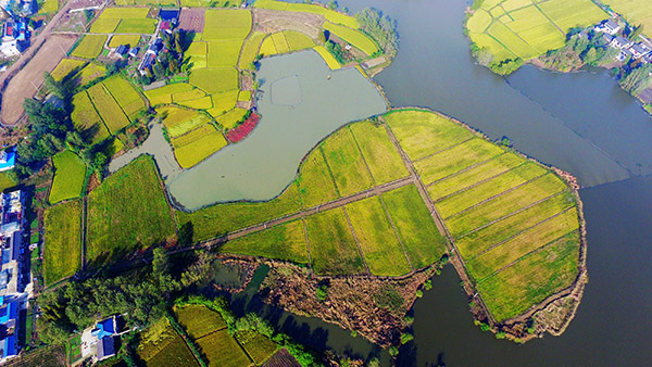金秋十月,江蘇省揚州市槐泗鎮(zhèn)晚稻大面積成熟,稻田猶如一塊塊金色“地毯”,構(gòu)成一幅美麗的豐收畫卷。