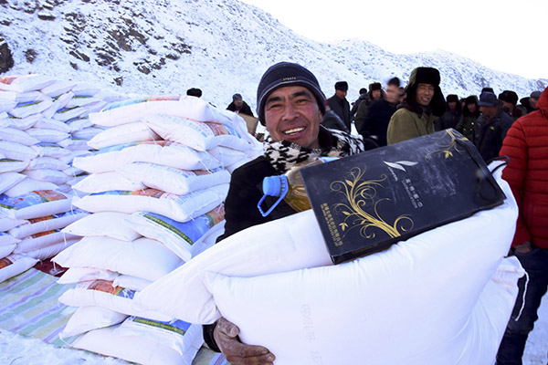 在距離塔城市300公里的托里縣多拉特鄉(xiāng)“冬窩子”哈拉包爾,阿克塞村村民領(lǐng)到援疆干部送來的生活物資(12月3日攝)。