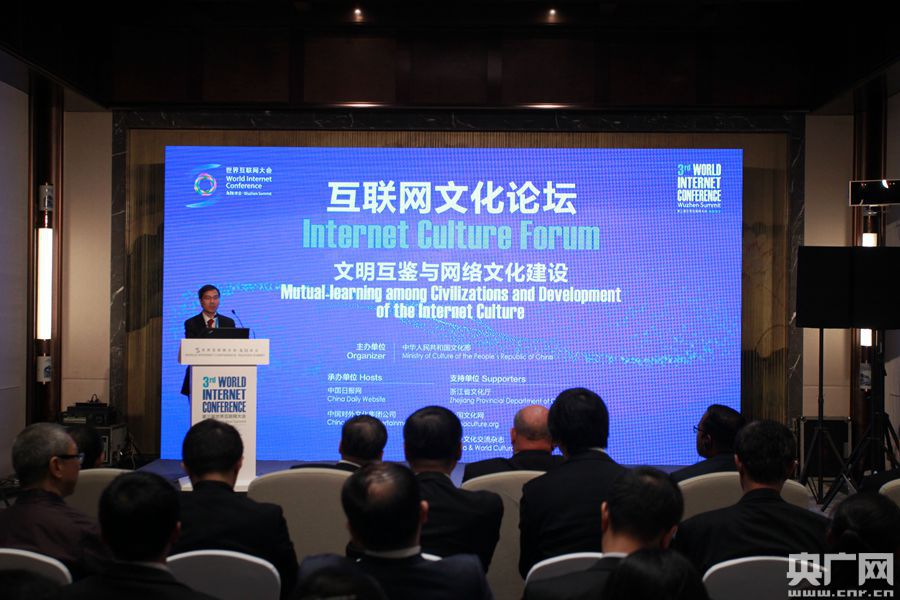 第三屆世界互聯(lián)網(wǎng)大會互聯(lián)網(wǎng)文化論壇11月17日下午在烏鎮(zhèn)互聯(lián)網(wǎng)國際會展中心運(yùn)河廳舉行。論壇以“文明互鑒和網(wǎng)絡(luò)文化建設(shè)”為主題,中國文化部副部長項(xiàng)兆倫致歡迎詞,白俄羅斯文化部副部長切爾尼克、中國藝術(shù)研究院院長連輯、馬爾代夫駐華大使穆罕默德?費(fèi)薩爾和復(fù)旦大學(xué)中國研究院院長張維為作主旨演講,16位國內(nèi)外互聯(lián)網(wǎng)和文化業(yè)界代表將圍繞“增進(jìn)人文交流 促進(jìn)文明互鑒”和“共同推動網(wǎng)絡(luò)文化繁榮發(fā)展”議題深入探討和交流,來自國內(nèi)外近100位嘉賓參加論壇。(央廣網(wǎng)記者 韓靖攝)