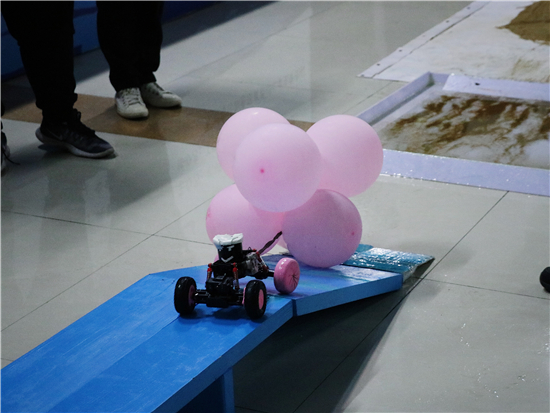 大大的紙箱保護(hù)著雞蛋,再栓上氣球,雞蛋如一個(gè)遠(yuǎn)行的孩童四處探尋生活的意義——起飛、落地、越野、完好無損!“飛蛋旅行”計(jì)劃成功!“TOP白給隊(duì)”的“飛蛋旅行記”給人以大大的驚嘆號(hào)!按蠹埾浜蜌馇蚨际潜Wo(hù)裝置,氣球具有彈性能起到減震作用,可以幫助穩(wěn)定下落的紙箱,以便雞蛋成功運(yùn)輸。”成員之一、18車輛專業(yè)岑金洲解釋他們的設(shè)計(jì)思路。這次,在運(yùn)輸裝置上他們利用了TOP模型協(xié)會(huì)閑置的遙控越野車架,通過對(duì)電子調(diào)速器和控制接收器更換的方式,帶領(lǐng)雞蛋順利通過沙地賽道、淺水池、獨(dú)木橋。賽后,他們感言,“在速度控制上我們還有更多的改進(jìn)空間,不過總的來說收獲很大!在合作中我看到了團(tuán)隊(duì)的力量!”