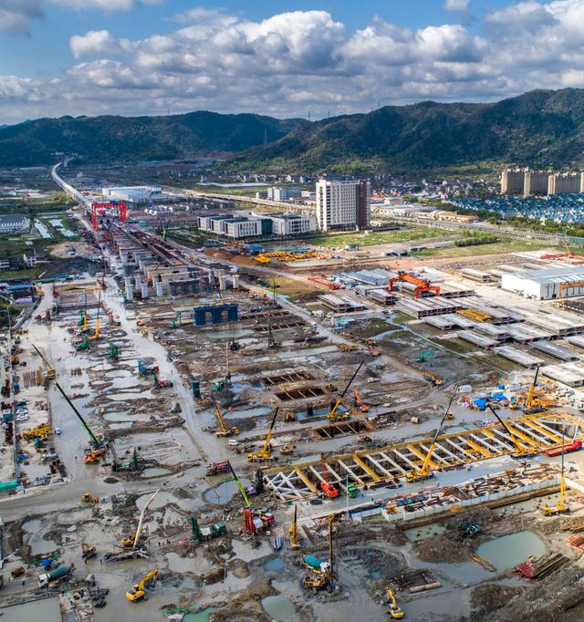 4月2日,在浙江杭(州)紹(興)臺(州)鐵路重點(diǎn)控制性工程臺州中心站和臺州中心站特大橋施工現(xiàn)場,起重機(jī)、挖掘機(jī)、旋鉆機(jī)等大型機(jī)械正在工作,運(yùn)輸車輛、運(yùn)梁車來回穿梭,工地上一片繁忙景象。