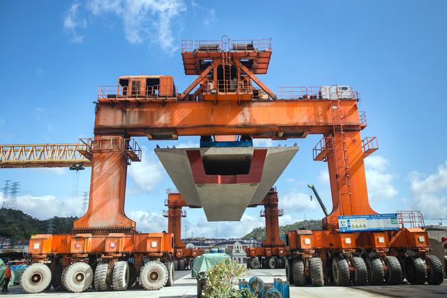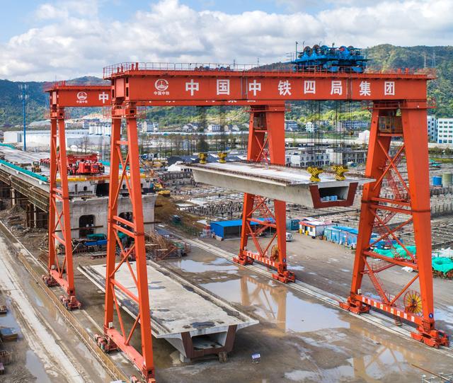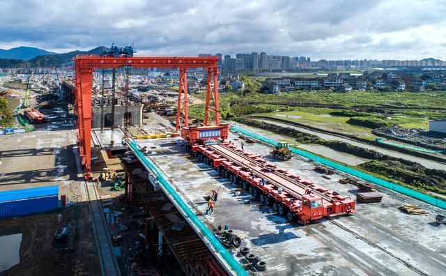 杭紹臺鐵路施工現(xiàn)場,900噸運(yùn)梁機(jī)正在運(yùn)送箱梁 郎成濤 攝