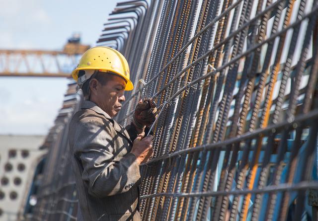 杭紹臺鐵路臺州制梁場施工現(xiàn)場,工人正在綁扎鋼筋 郎成濤 攝