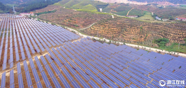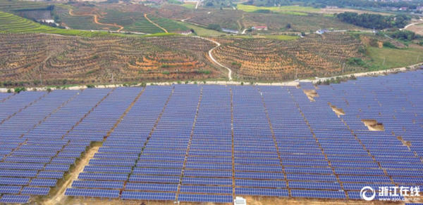 10月10日,湖州市吳興區(qū)埭溪鎮(zhèn)東紅村光伏發(fā)電項(xiàng)目。發(fā)電基地面積1400畝,原為廢棄多年的礦山。整個(gè)項(xiàng)目分兩期,目前一期700畝已經(jīng)建成并網(wǎng)發(fā)電,千余村民每人每年因此增加1000多元的土地出租收入。(浙江在線拍友 鄧德華 何偉衛(wèi) 攝)