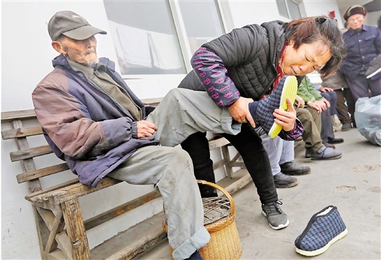 近日,常山縣大橋頭鄉(xiāng)客弄村傅珍芳(右)為衢江上方鎮(zhèn)和灰坪鄉(xiāng)的敬老院送去70雙棉鞋,F(xiàn)年60歲的她從2009年開始免費為衢州幾十家敬老院和附近村莊老人縫制過冬棉鞋,共送出6000多雙棉鞋,被大家親切地稱為“棉鞋阿姨”。(拍友 鮑衛(wèi)東 錢李源 攝)