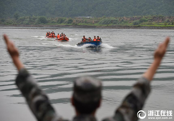 5月15日,杭州臨安區(qū)潛川鎮(zhèn),基層黨員、民兵進(jìn)行沖鋒舟救援技能訓(xùn)練。